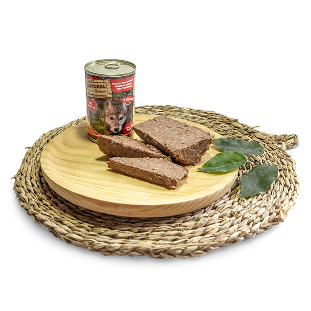 Chicken carrots pineapple linseed and cranberries recipe is an excellent complete wet recipe for puppies from weaning onwards. Formulated without cereals and with a single protein this recipe includes superfoods such as carrots, pineapple, flax seeds, and cranberries.